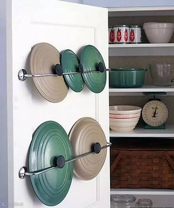 橱柜门也不能放过,安两根架子不仅能放锅盖,放上锅具也毫无压力。