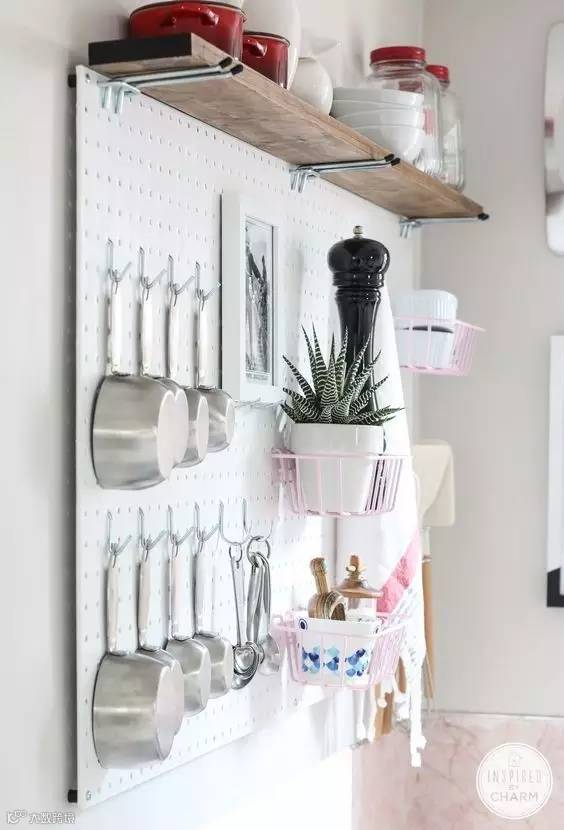 东西多,就把墙面利用起来。安一块洞洞板,放上横板和挂钩,既能够挂锅放碗,还能放几盆盆栽,给厨房带来一抹清新~