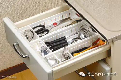厨房中最多的柜子和抽屉,所以抽屉的空间自然是要好好利用。抽屉收纳,最关键的是要有序排放。如果想让抽屉有序收纳,大家可以购买抽屉分割器,这在许多家居店里都可以买到,在部分五金商店也可以购买。你也可以购买一些价格比较低的餐具盘,上面一般都划分好了放刀、叉、勺子的地方。抽屉收纳最需要晋级的就是,不要把抽屉当做废品收购站,把任何不需要的东西都往抽屉里扔,那样基本就是厨房杂乱的开端。