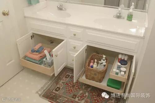 如果你的卫生间已经空间利用最大化,但还有很多东西无处可放怎么办?其实可以参考厨房的收纳,把抽屉和橱柜中安装一些特殊的五金件,或柜子侧面的挂篮等,收纳只要做到合理有序,就能腾出最大空间。除此之外,你还可以选择可移拉式的镜子,这样在镜子后面还可以安装一个柜子,里面放一些面部护理用品或剃须刀等常用物品。