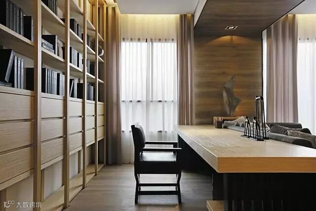 书桌后面依墙打造的原木框架的书架柔和的色调给人视觉上的舒适感,摆放整齐的各类书籍透露出业主可能是一位饱读诗书,博学多才的知识分子。