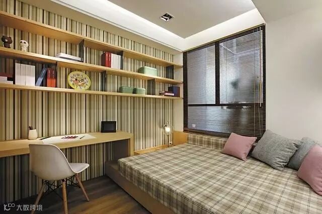 次卧的设计相对热闹了很多,榻榻米式的床给人慵懒、随意之感,依墙打造的置物架上各式装饰品丰富,十分热闹。
