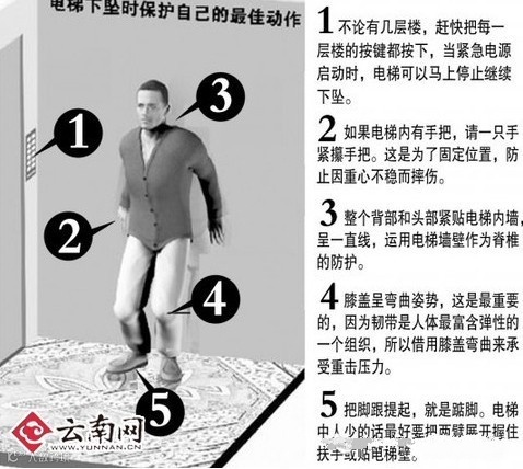 当你面临生死一线间时,当下的你所做的每一个动作将决定你的生死与否。 生活中,难免会坐到电梯,但是,万一遇到电梯发生事故,迅速往下坠落时,你可能产生一个念头,站在电梯里随它吧! 可是今天 .... 我在电视的一个外国频道看到一个非常好的节目。 其中,他们还请了专家示范 ..... 「电梯下坠时保护自己的最佳动作」