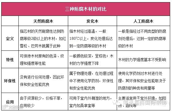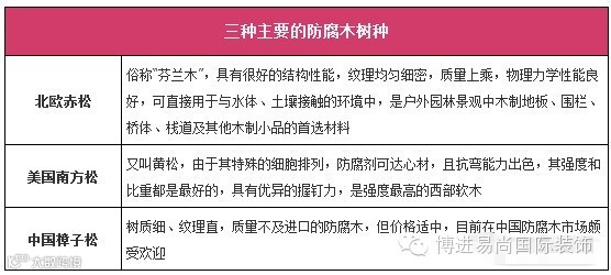 从上表可以看出,三种防腐木不论是在处理上,还是环保特性、木材特性以及应用方面存在较大差异。因此可以根据各自的特性,对照选择最适合自己需求的防腐木产品。