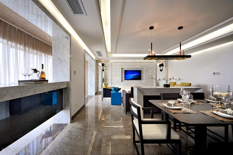 (3)材质:拉毛粉饰、大理石的运用,使室内装饰更讲究材质的变化和空间的整体性。