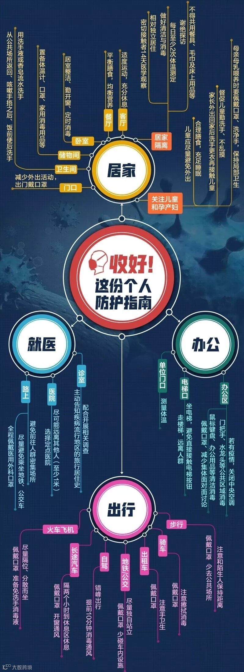 少出门:下班后需外出的,洗手后佩戴一次性医用口罩,家中做好通风。远离医院及人多密闭的环境:如超市、娱乐场所等,减少接触病毒感染源的来源,不与有呼吸道症状者密切接触。