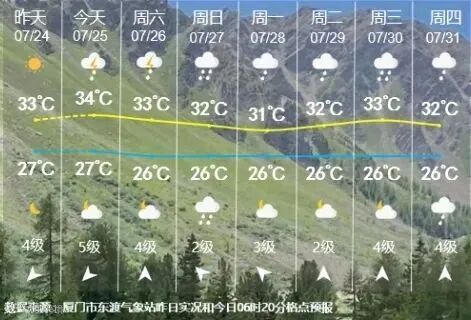 厦门城区最高气温31℃~34℃