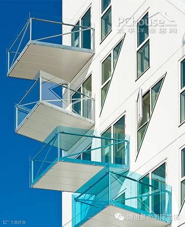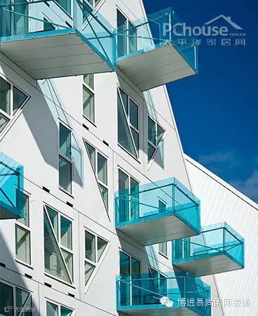 阳台的玻璃颜色由底部的深蓝逐渐变成顶部的透明色,与冰川的色系相呼应——独特的阳台形状为住户的都市生活中提供了一些多样的色彩。