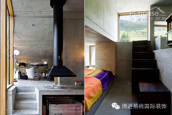 琠个别墅充分呼应瑞士人对于完美的追求,精巧地将功能和美观性结合在一起。外立面上的窗户被精心设计,从而更好地体现出内部不同的层次。而外表上的带有图案的混凝土件也同时作为通风和烟道之用。石质的庭院内带有富有特色的天然温泉,独特的角度保证使用者在享受美景的同时也能保持隐私。视线内四周的阿尔卑斯山让人仿佛置身其中。