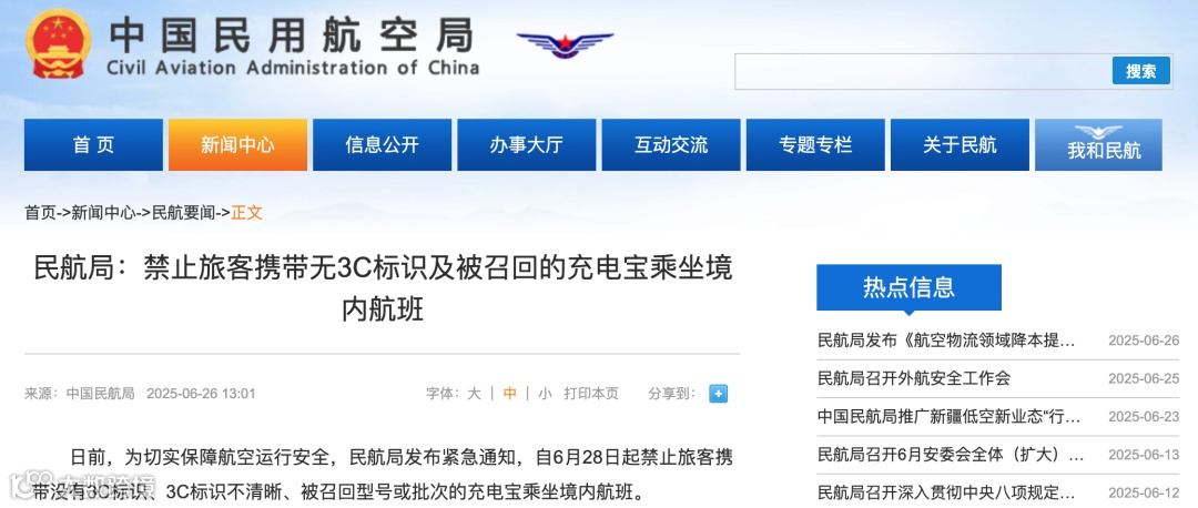 6月26日,民航局一纸“3C标识限制令”,要求自6月28日起,旅客不能携带没有3C标识、3C标识不清晰、被召回型号或批次的充电宝乘坐境内航班。