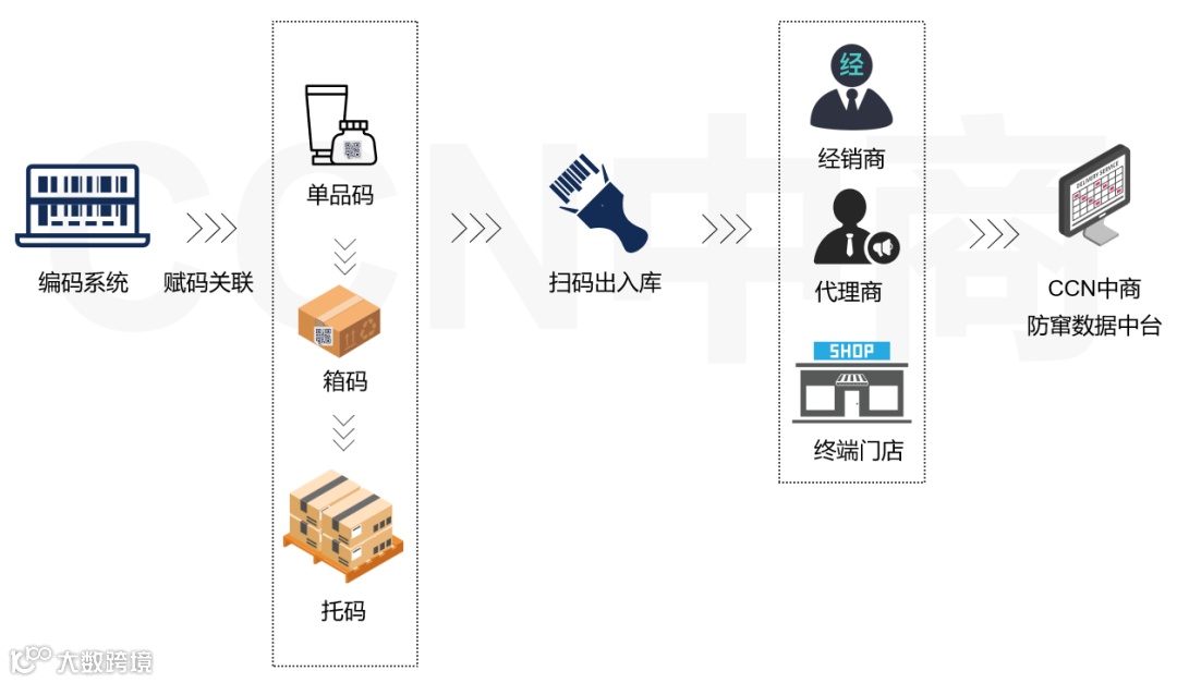 CCN中商基于加密算法生成产品唯一标识码,根据产品实际包装规格进行单品-箱-托等进行包装层级关联、采集;仓储物流环节,针对产品进行PDA扫码出入库及退货,市场流通环节,针对产品进行扫码收发货,将企业与全链路上的关键角色进行连接,通过扫码作业精准追溯产品在生产、仓库、分销、零售、消费等各个环节实时流通数据,实现货物流向的可视化管理。任何一个环节出现异常,都会触发预警机制,助力企业管理者快速定位窜货区域及窜货方,把问题消灭在萌芽状态,以此净化市场销售环境。