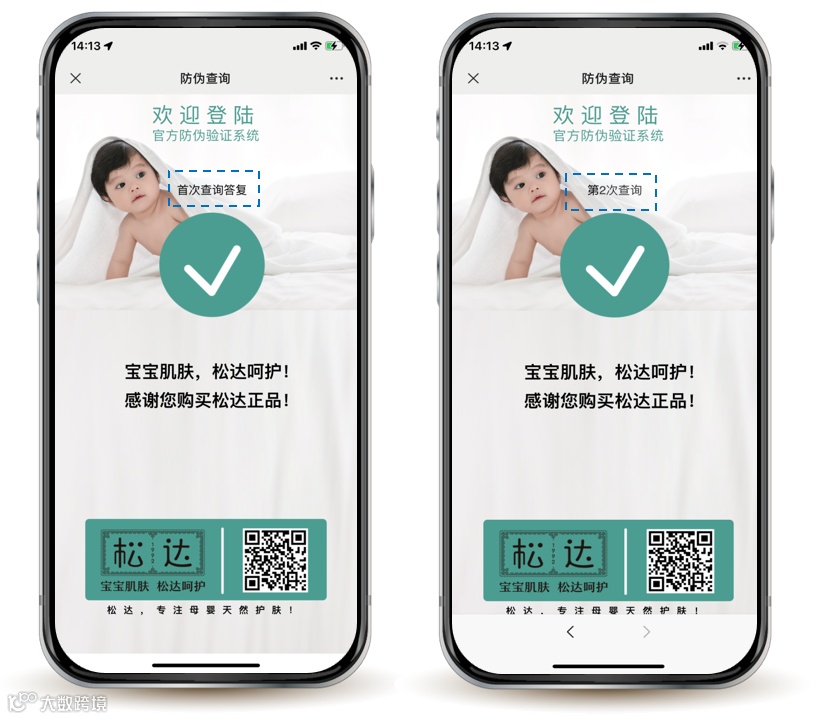 宝妈宝爸们在购买松达产品后,仅需使用手机扫一扫产品包装上的防伪二维码便可查验真伪。通过防伪系统实现产品防伪查询功能,为宝宝们使用正品再加一道安全防线。