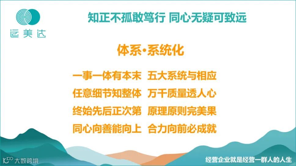 董事长再次强调,“运美达发展到今天,原有的系统已经无法适应企业发展和客户需求,把系统建好,企业才有机会跃升,成为骨干企业”。要求全体干部伙伴人人都秉持“体系化思维,系统化干法,使命化活法”,人人都是最强的系统根基!如果一个老员工能带动5个新伙伴,我们就敢接超3千万5千万的大订单,这才是运美达的强大系统力。