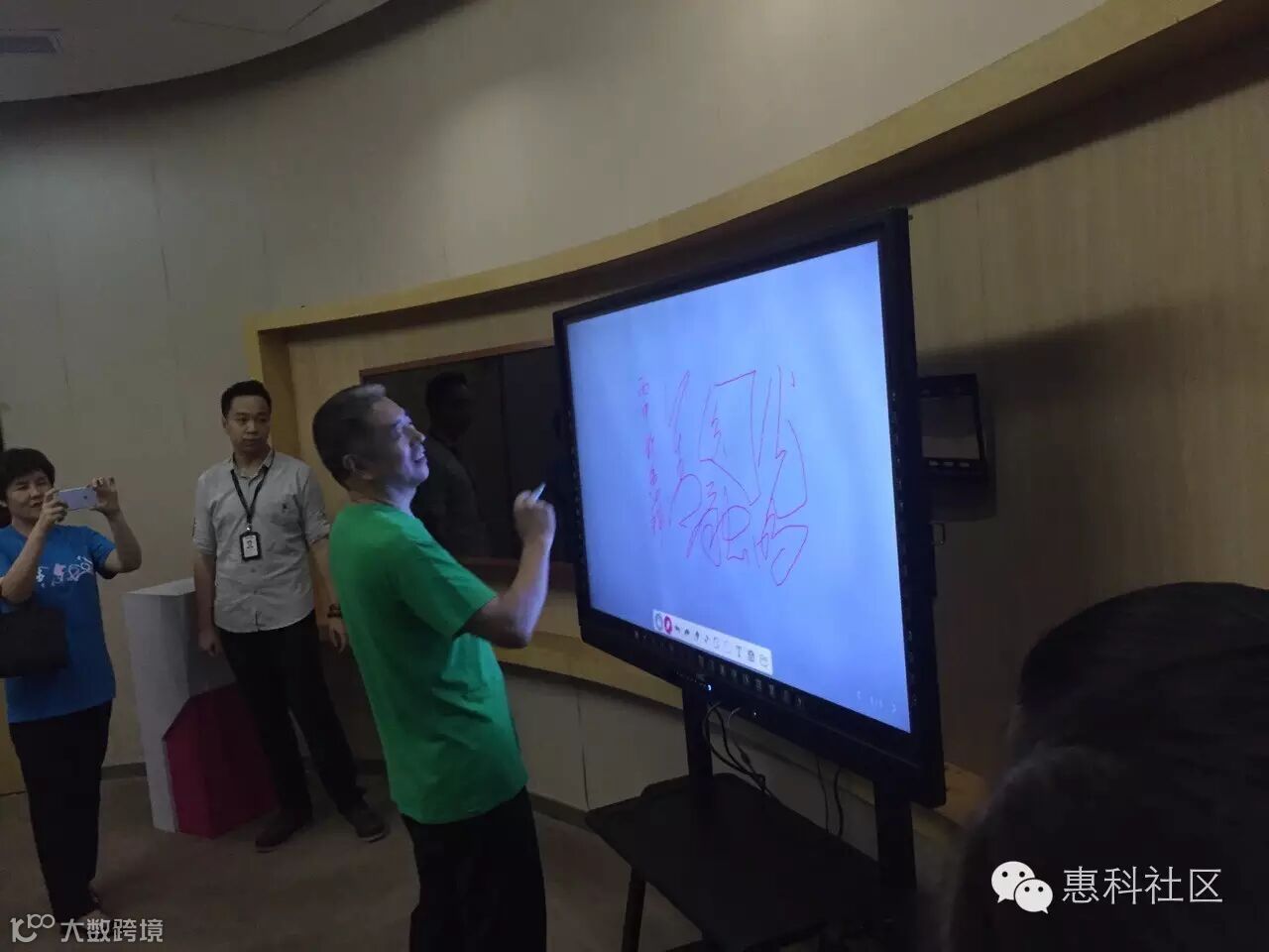 7月30号,丫山的学长们早早就来到惠科,参加了惠科研发与生产中心管理干部的早会,感受了惠科浓浓的工作氛围。惠科集团副总裁蒋旭光、研发总经理何怀亮带领惠科集团技术骨干亲自接待,并对展览厅的产品一一做了演示介绍,激起学长们的一震激动与好奇,从超大屏的家庭影院,到风靡全国的网咖的曲面一体机;从超薄到透明电视、到广告机到智能科教系列,让梓林学长也不禁兴趣盎然地尝试,“挥毫落纸”在智能白板题上“光明、圆融、善”。