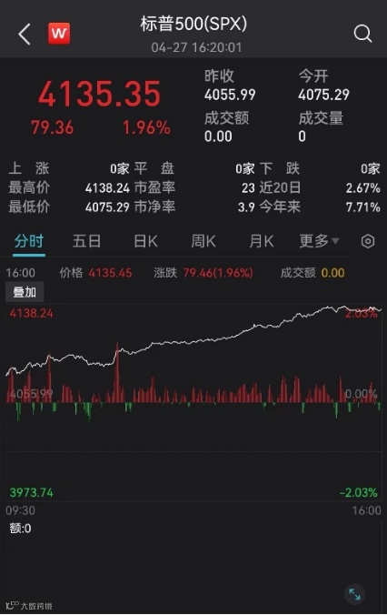 当地时间4月27日,美股三大股指全线收涨,道指涨1.57%报33826.16点,标普500指数涨1.96%报4135.35点,纳指涨2.43%报12142.24点。