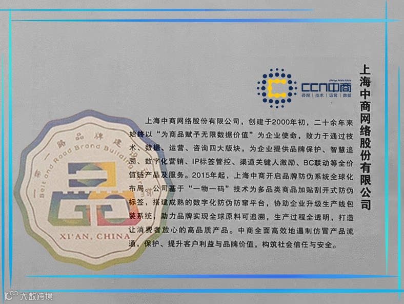 早在2001年,上海中商网络股份有限公司(简称“CCN中商”)便成为中国质量万里行促进会防伪行业首批成员单位,赋能品牌建设二十余载,积极响应“一带一路”倡议,奋力推进国际化业务发展,致力于带领更多高质量品牌走出国门,走向世界。