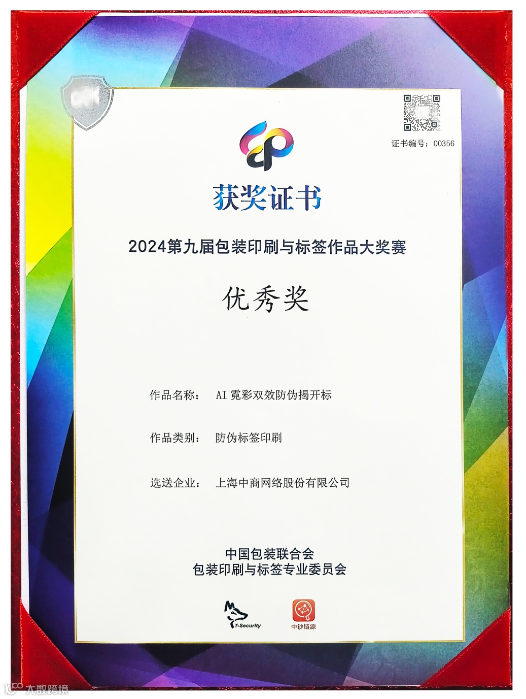 由中国包装联合会主办,深圳市包装行业协会支持的“2024第20届包装印刷与标签年会暨‘西门子工业软件’杯第9届包装印刷与标签作品大奖赛颁奖典礼”在深圳隆重举行,典礼上,上海中商网络股份有限公司3D霓彩双效技术标签荣获“优秀奖”。