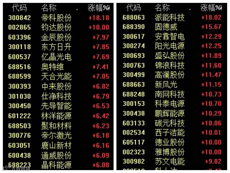 今天上午,新能源赛道大反弹,TOPCon电池、钠离子电池、POE胶膜、储能等板块涨幅居前。龙头股集体暴涨:宁德时代上涨4.98%,阳光电源涨超12%,通威股份涨超6%,派能科技涨超18%,亿纬锂能涨超8%,昱能科技20%涨停,禾迈股份涨超19%。