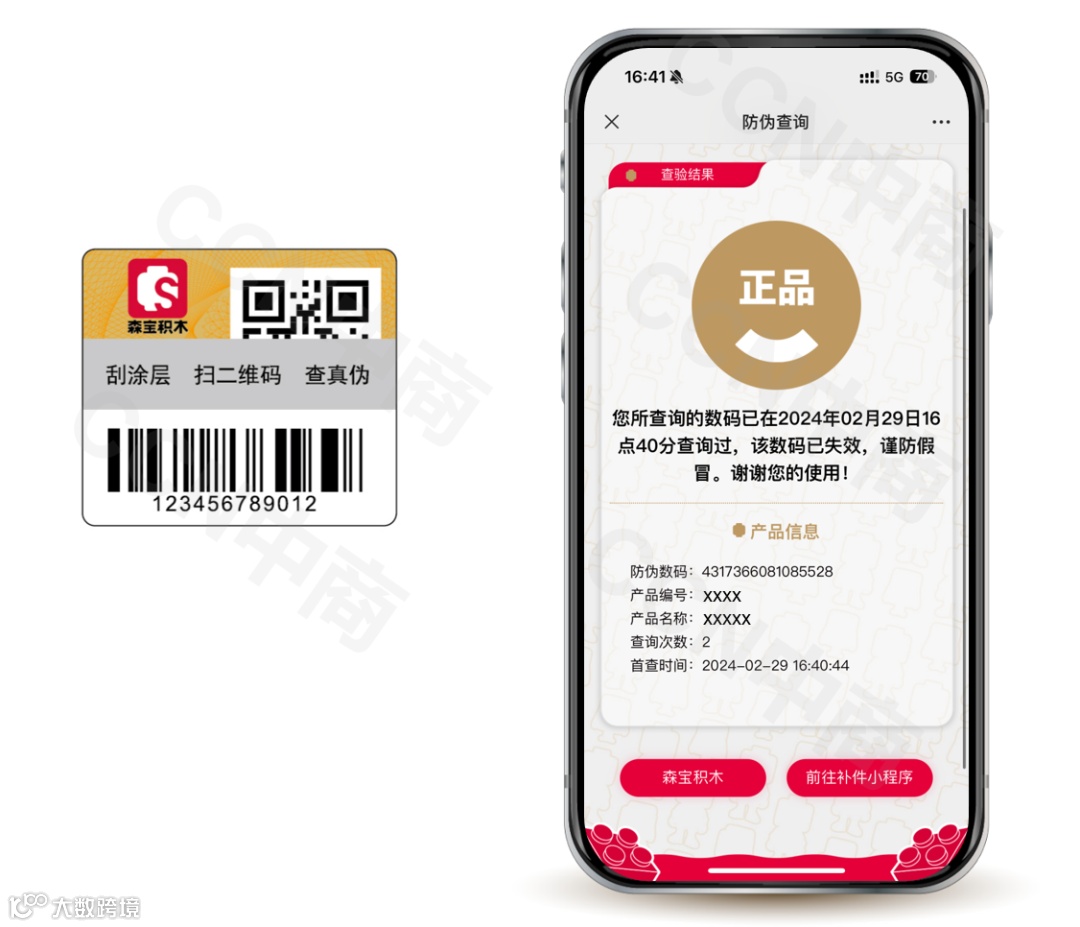 CCN中商为每一件森宝积木附上专属防伪标识,标识外表暗码部位印有能够刮开的刮刮银油墨,刮开涂层才可见16位防伪码,以此提高数码防伪的保密性与安全性。