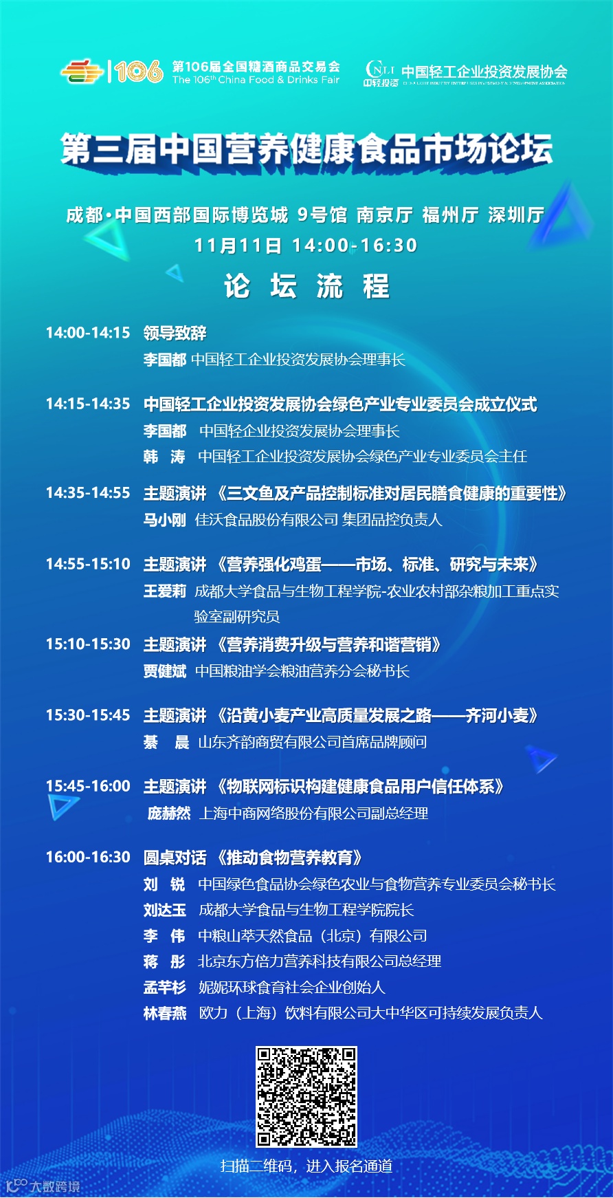 11月11日,由全国糖酒商品交易会组委会和中国轻工企业投资发展协会共同主办,中国绿色食品协会绿色农业与食物营养专委会、中国粮油学会粮油营养分会、中关村科技园区平谷园管理委员会、上海中商网络股份有限公司等协办的“第三届中国营养健康食品市场论坛”将在第106届全国糖酒商品交易会上隆重召开。
