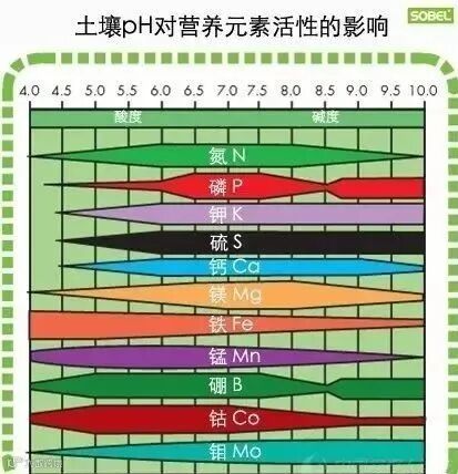 从上图我们可以看出,大多数养分在土壤中性的时候吸收最好,土壤过酸过碱对于我们肥料的投入效率都有影响。