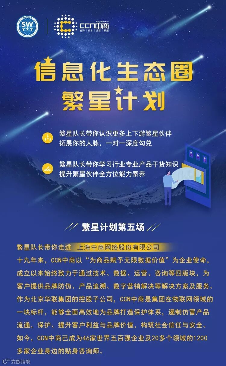 5月21日,来自信息化生态圈的40余家企业的生态高管齐聚CCN中商参加繁星计划第5场活动——走进上海中商网络股份有限公司(以下简称CCN中商)。