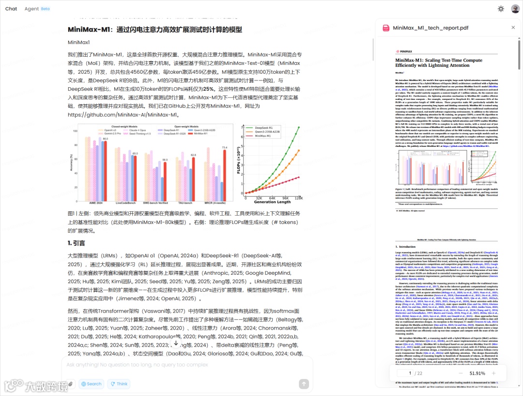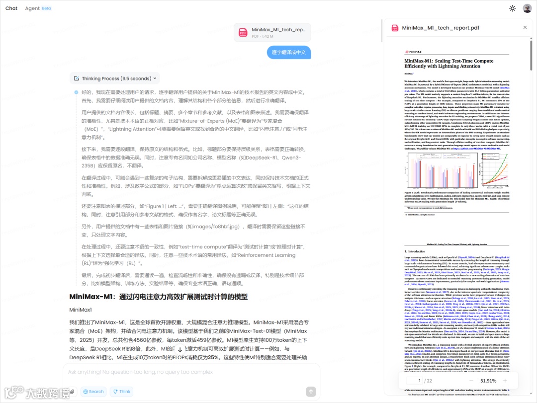 作者在第一时间对 MiniMax M1 进行了实际测试,其表现令人惊叹。当作者将 MiniMax - M1 的技术报告输入模型,要求其逐字翻译时,M1 不仅准确地翻译了文字内容,甚至还将报告中的图、公式以及表格都完整地处理并翻译出来,尽管在图表呈现上还未达到 100% 的完整度,但文字部分无一遗漏,甚至还贴心地根据自己的判断省略了作者认为用处不大的 5 页参考文献。在另一个有趣的翻译测试中,作者输入一个文档,并要求 “翻译成中文,在括号里标注一些符合我英语水平的原文英文词汇或短语。我英语水平是大学六级”,M1 精准地完成了任务,再次展现了其强大的上下文理解和执行能力。