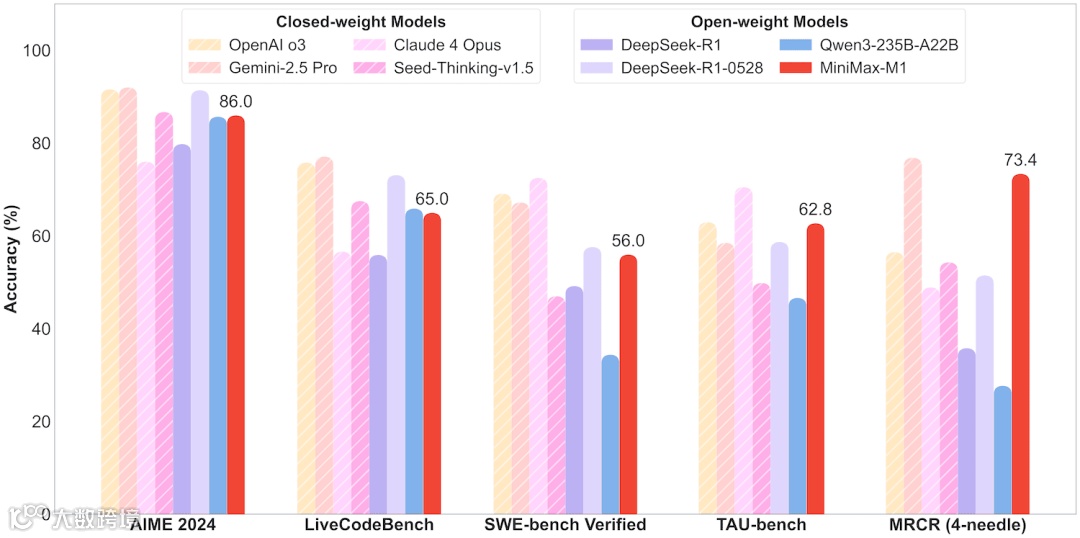 MiniMax M1 的上下文能力堪称卓越,在全球范围内的开源模型中脱颖而出,足以与 Gemini 2.5 Pro 相媲美,被誉为新一代 “源神” 。在不同类型的测试任务中,M1 展现出了各异的性能表现。在 AIME 2024 逻辑数学题目这类偏奥数思维的测试以及 LiveCodeBench 编程题、SWE-bench Verified(真实世界代码补全 + 修改)测试中,M1 的表现处于中规中矩的水平,在部分任务上表现较弱,而在另一些任务上表现较强。例如,在 AIME 2024 数学竞赛题目中,一些复杂的逻辑推理和计算问题,M1 的解题准确率并未达到顶尖水平。在 TAU - bench 测试(该测试需要模型理解任务目标、推理动机的场景)中,M1 的准确率达到了 62.8%,这一成绩使其开始在开源模型中崭露头角,能够较好地应对需要深度理解和推理的场景任务。