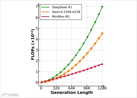 M1 在上下文性能上的出色表现,核心得益于其之前开源的基座模型 MiniMax - 01。MiniMax - 01 采用的 Lightning Attention 线性注意力机制发挥了关键作用,使得 M1 的时间和空间复杂度随序列长度增加近似线性增长,而非像传统 Transformer 那样呈平方级膨胀。在推理生成长度 64K token 时,M1 的 FLOPs(浮点运算次数)消耗不到 DeepSeek R1 的一半;当生成长度达到 100K token 时,M1 仅消耗其约 25% 的 FLOPs,这一优势在处理超长上下文时尤为明显。MiniMax - M1 与之前开源的基座模型 MiniMax - 01 一样,采用 456B 参数,MoE(混合专家模型)架构,实际激活 45.9B。其最长上下文长度为 100 万字,即 1M,是 DeepSeek - R1 的 8 倍。此次开源的推理模型分为 40K 和 80K 两个版本,80K 版本是在 40K 版本基础上进一步训练得到的增强版本,这里的 80K 和 40K 指的是 Extended Thinking 的上限,而非上下文长度。