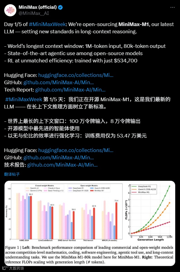 在 AI 行业的激烈竞争格局中,曾被寄予厚望的 “六小虎” 一度沉寂许久。然而,MiniMax 却在近日打破了这份宁静。6 月 16 日深夜将近 12 点,MiniMax 在 X 平台上出人意料地预告了一整周的发布计划,这一操作让不少业内人士感到意外,毕竟如此 “阴间” 的发布时间点并不常见。而在计划的首日,MiniMax 就推出了 MiniMax Week 的首个项目 —— 开源其首个推理模型 M1,这一开源举动着实令人眼前一亮。