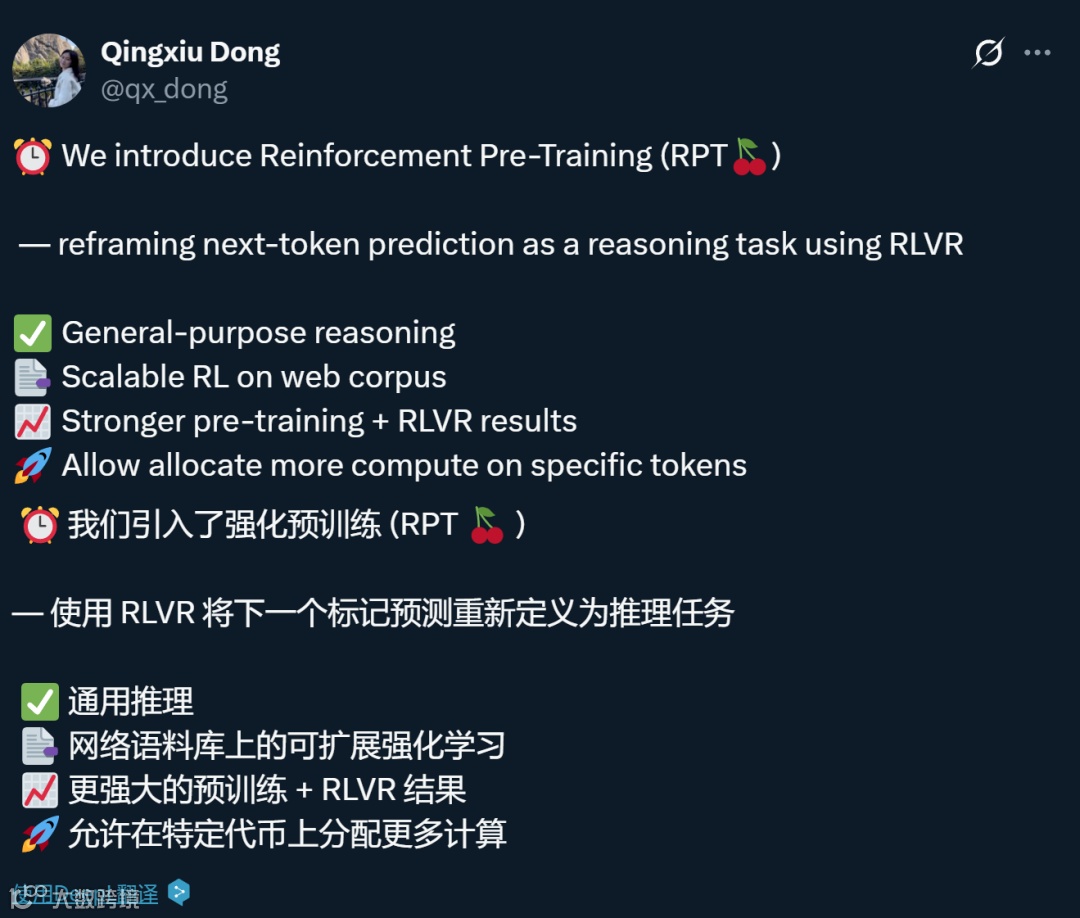 在此背景下,强化预训练(Reinforcement Pre - Training, RPT)这一全新范式应运而生。RPT 将传统的 next - token 预测任务进行了大胆重构,转变为 next - token 推理过程。在这个过程中,对于预训练语料中的任意上下文,模型不再是简单地预测下一个 token,而是需要在预测前对后续 Token 进行深入推理,然后通过与语料中真实的 next - token 进行比对,获取可验证的内在奖励。这一过程无需外部标注或特定领域的奖励函数,就能够将传统 next - token 预测所使用的海量无标注文本数据,巧妙转化为适用于通用强化学习的大规模训练资源。