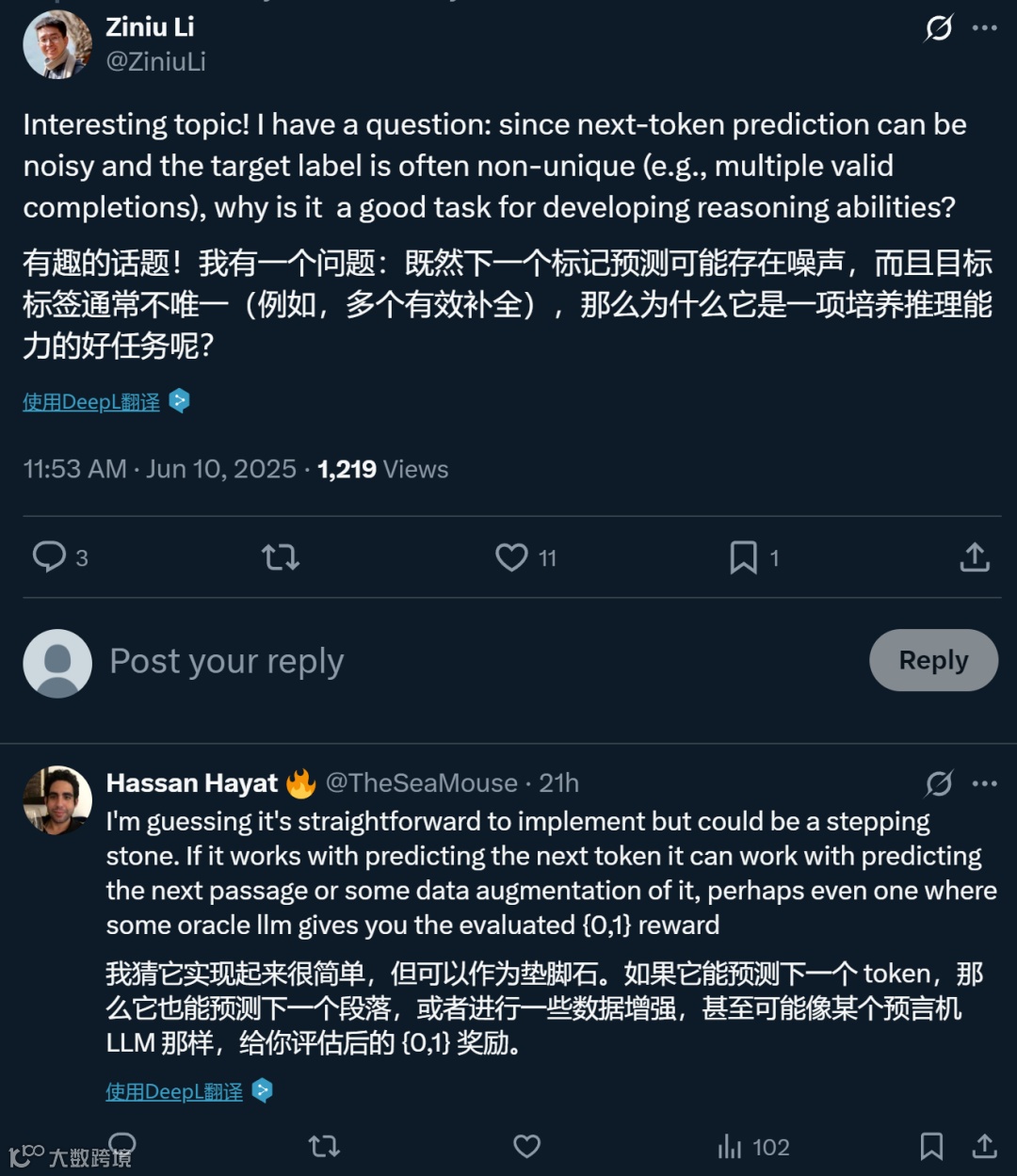 尽管 RPT 展现出诸多优势,但作为一种全新的方法,社区对其有效性、效率和前景仍存在疑问。例如,在实际应用中,RPT 的训练过程是否会过于复杂,导致计算成本过高?其在不同领域的泛化能力是否能够持续保持?这些问题都有待进一步的研究和验证。但无论如何,RPT 的出现为语言模型预训练的发展开辟了新的道路,就像在黑暗中点亮了一盏明灯,为人工智能领域的研究者们提供了新的探索方向。在未来,随着研究的不断深入和技术的持续发展,或许 RPT 将引发一场人工智能模型训练的变革,让我们拭目以待。