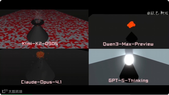 复杂场景测试则更具说服力。火山喷发 3D 模拟任务要求模型同时掌握 WebGL 编程、物理引擎原理和视觉设计原则。Kimi 生成的代码不仅正确实现了岩浆粒子的运动轨迹计算,还加入了地面震动的涟漪效果和烟雾扩散的物理模拟,这种超出需求预期的细节处理展现了模型的深度理解能力。而 GPT-5-Thinking 虽然代码结构严谨,但视觉表现过于简陋;Qwen3-Max-Preview 则在物理参数计算上出现明显偏差,导致岩浆呈现不自然的悬浮状态。