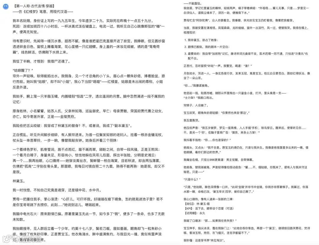 跨领域能力测试则展现了 Kimi 的均衡发展。在红楼梦风格的古代言情穿越小说创作中,Kimi 将现代穿越元素与古典文学笔法融合得恰到好处,"今儿个我瞧妹妹的这个样子,竟有几分眼熟" 的台词既符合人物身份,又暗藏穿越者的微妙心态。更令人惊讶的是 "士力架认亲" 的创意设定,将现代零食自然地植入古代场景,这种脑洞大开又不失逻辑的设计展现了模型强大的创意生成能力。相比之下,其他模型要么过于拘泥于古典风格而显得呆板,要么现代元素植入过于突兀而破坏整体氛围。