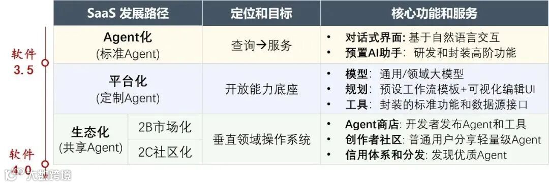 SaaS 的 Agent 化改造催生新商业范式:Salesforce 推出 Agent Cloud,允许企业客户在 Einstein 大模型基础上,通过低代码工具构建专属的销售谈判 Agent、客户流失预测 Agent;Notion 的 Agent Marketplace 汇聚了 2000 + 行业模板,中小公司可直接调用 "跨境电商合规 Agent"" 短视频脚本生成 Agent"。当 AIGC 平台 MidJourney 推出 Agent API,允许用户定义" 我的专属艺术顾问 Agent" 时,软件的边界已从功能集合进化为具备自主学习能力的数字伙伴。