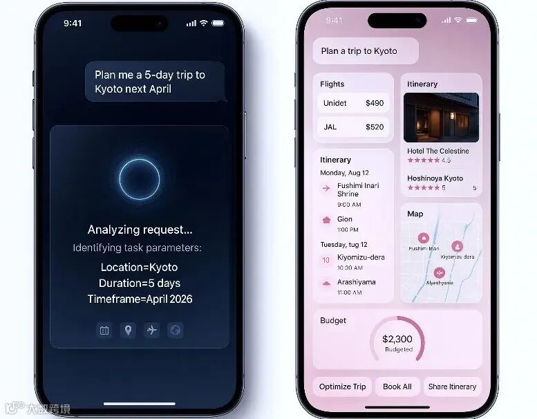 智能手机的进化史是人机交互的微缩史:2007 年 iPhone 重新发明了触屏交互,2025 年的 iPhone 20 Pro 则内置了 NPU 算力提升 10 倍的 A18 芯片,支持全天候运行百亿参数模型。但真正的变革来自新型终端:苹果 Vision Pro 构建的空间计算平台,通过眼动追踪、手势识别、环境光感知,实现了 "意图级交互"—— 用户凝视日历图标并点头,即可触发旅行 Agent 的行程规划;Meta 的 Neural Lace 脑机接口原型,虽未公开商用,但已在实验室实现通过神经信号启动健康管理 Agent。