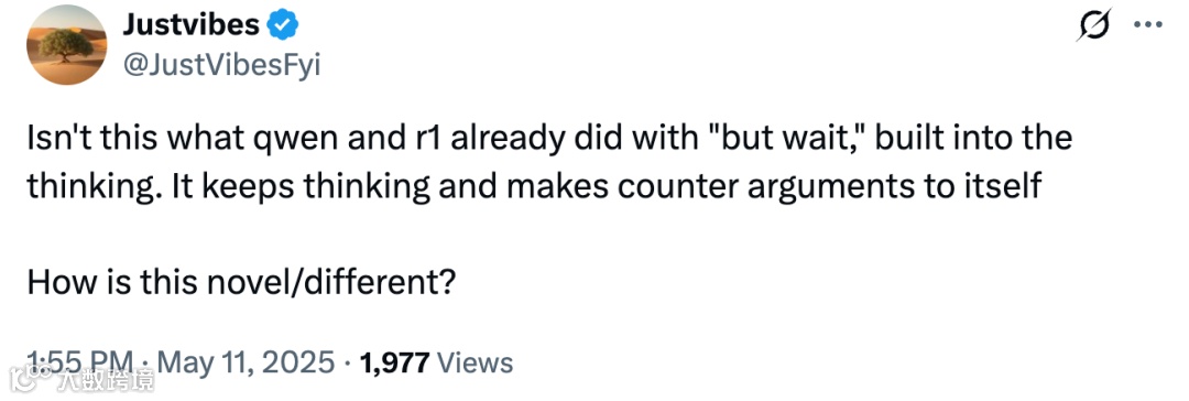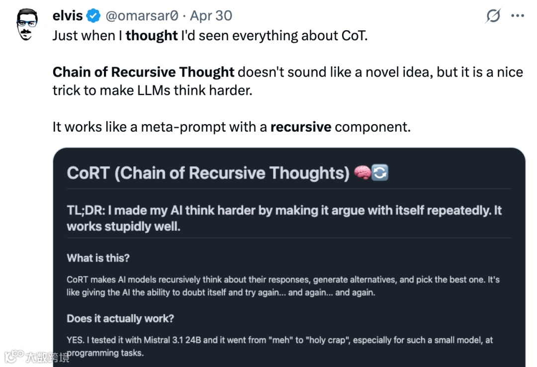 从工业界实践来看,许多主流模型早已具备类似的反思能力。例如,Cursor中配置的Gemini 2.5 Pro会在生成答案前“思考”一分钟,期间不断自我反驳,直至找到最难以推翻的结论;Qwen和R1模型的“but wait”模式则通过特定触发词,强制模型延长推理链,对潜在错误进行二次检查。这些机制与CoRT的差异主要体现在流程的标准化程度:CoRT将反思过程明确划分为“自我评估-替代生成-迭代优化-动态深度控制”四个步骤,形成可复现的技术框架,而现有模型的反思更多依赖经验性的参数调整或简单触发逻辑。还有观点认为,CoRT本质上是“元提示”的递归应用。传统元提示通过在输入中加入引导性语句(如“请分步骤思考”),促使模型生成更详细的推理过程;而CoRT则让模型在生成响应后,自动生成新的提示(如“当前答案是否存在逻辑漏洞?”),触发下一轮反思,形成提示的嵌套调用。这种递归式的自我提示,本质上是对元提示技术的流程化扩展,而非颠覆性创新。