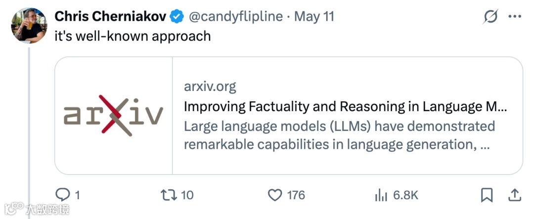 尽管CoRT在GitHub上的星标数两周内接近2000,显示出极高的关注度,但其技术本质却引发了关于“创新性”的激烈讨论。许多研究者和网友指出,CoRT的核心思想并非突破性发明,而是对已有技术的系统化封装。追溯技术渊源,2023年发表的论文《Improving Factuality and Reasoning in Language Models through Multiagent Debate》提出的多智能体辩论框架,早已展现了类似的思路。该方法通过模拟多个智能体扮演不同角色进行辩论,让“正方”和“反方”相互质疑,迫使模型在对抗中修正错误、完善推理。CoRT的“生成替代方案并评估”机制,本质上是这种多智能体辩论的“单模型内省”版本——模型不再分裂为多个独立智能体,而是通过自身的不同“化身”生成竞争性方案,实现内部辩论。两者的区别在于协作形式,而非核心逻辑。