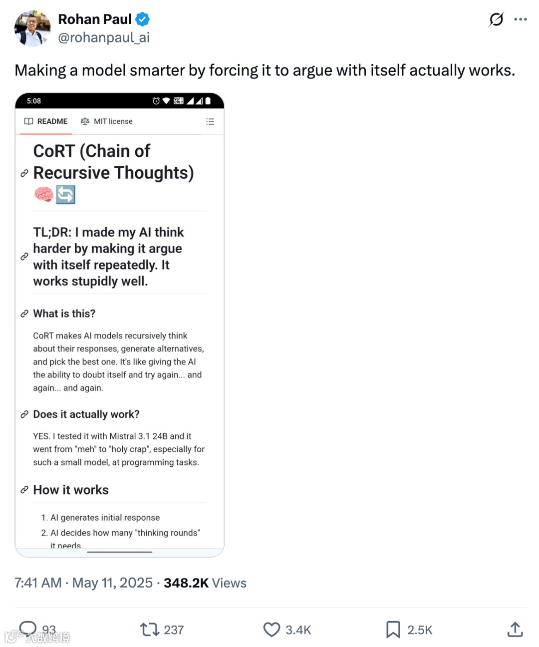 站在更宏观的角度,CoRT的争议也提醒我们:评价一项技术的价值,需兼顾创新性、实用性和可扩展性。当业界沉迷于追求“全新概念”时,CoRT以其工程化的务实路径证明,技术进步同样可以发生在对现有体系的深度挖潜中。正如人类的认知升级往往不是突然的顿悟,而是通过持续的反思、修正与整合,AI模型的“智能”提升,或许也需要更多类似CoRT的“递归式进步”——在不断的自我批判与迭代中,迈向更复杂的推理能力。
