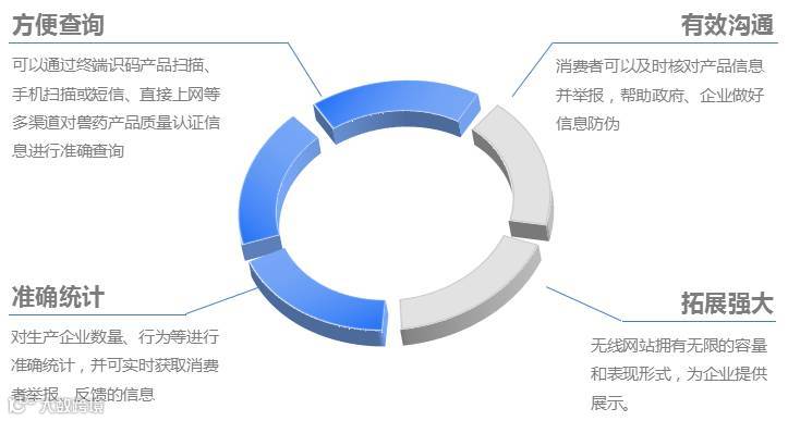 ,该系统可以为每件兽药产品赋予兽药国家监管码。同时与国家监管网平台对接。实现兽药企业产品生产包装,流通,销售等关键环节信息与国家监管平台信息互通。在以上数据支持下,监管平台可以为消费者提供兽药真假与质量查询服务,为政府监管部门执法打假、质量责任定位、产品召回提供数据支撑、为企业提升品牌形象,深化管理提供服务。