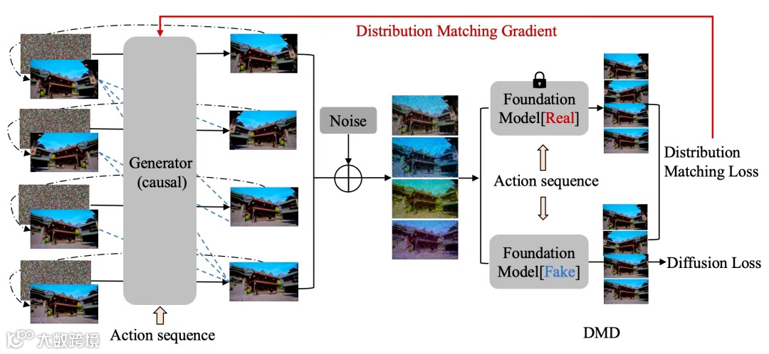 当然,Matrix-Game 2.0 也面临长序列视频常见的延迟与误差累积问题,但其通过三项专有机制有效解决了这些问题。因果扩散训练将双向扩散提炼为因果模型,仅依据历史帧生成当前帧,减少等待时间并提升推理速度。分布匹配蒸馏(DMD)在训练过程中最小化学生模型与原始模型的生成分布差异,保障长时间生成时的画面稳定性,减少偏差。KV-Cache 缓存机制保存注意力上下文,实现滚动生成,避免重复计算,即便在单 GPU 环境下也能达到 25 FPS 的实时速率。