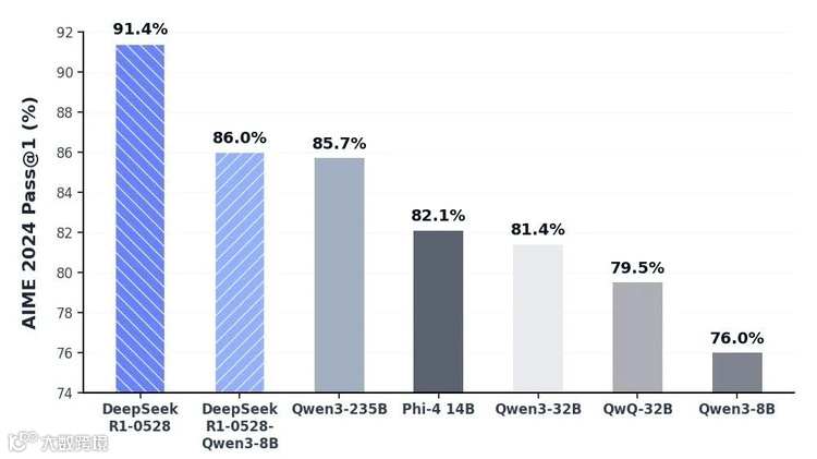 DeepSeek-R1-0528的另一大贡献在于思维链蒸馏技术的创新应用。团队将685B参数量的R1-0528的复杂思维链蒸馏到仅8B参数量的Qwen3-8B基座模型上,得到的DeepSeek-R1-0528-Qwen3-8B在AIME 2024测试中超越原版Qwen3-8B达10%,并与235B参数量的Qwen3-235B表现相当。这一成果彻底打破了“唯参数论”的迷思,证明通过高质量思维链的传递,小模型完全可以在特定任务上媲美大模型。
