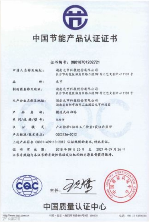 元亨冷却塔的高效、节能、节水、节地、低噪、可靠、智能等性能的关键指标均处于国际一流水平。经国家检测机构的检测,冷却塔产品的热力性能、漂水率、耗电比、噪音等关键技术指标处于国际先进水平,更取得了美国CTI认证、中国节水产品认证、中国节能产品认证、中国冷协CCTI认证。