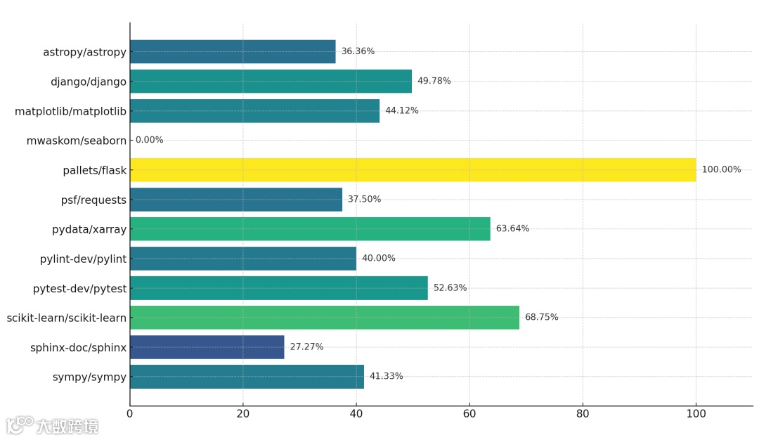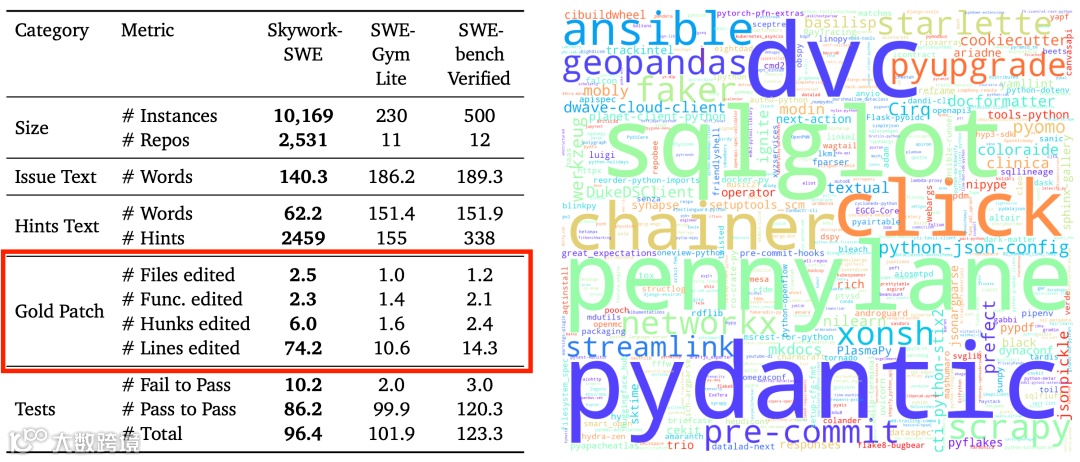 在任务数量与代码覆盖广度上,Skywork-SWE 数据集远超现有同类数据集。相较于其他基准数据集,其中的任务编辑复杂度显著更高,平均每个补丁涉及 2 个以上函数修改、6 个代码块和多达 74 行代码变更,真实反映了 GitHub 开发中问题修复的复杂性。数据集不仅包含 Pydantic、SQLGlot 等主流开源项目,还涉及大量中小型仓库,高度贴近真实开发生态,为模型提供了丰富多样的训练样本。