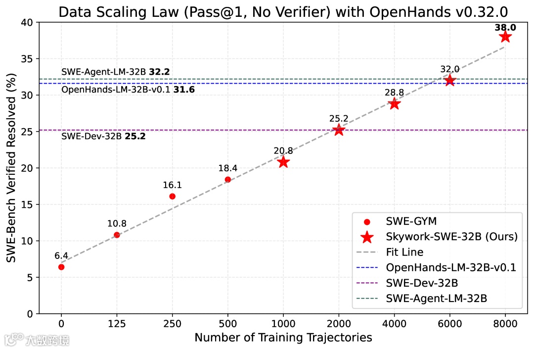 Skywork-SWE 的意义不仅在于其强大的模型性能,更在于它开创了一套系统化构建真实工程数据的范式。它收集的不是孤立的代码片段,而是来自 GitHub 仓库的实际修复任务,每个任务都具备可复现性、可验证性和可追踪性。这份数据集不仅成就了 Skywork-SWE-32B,更首次系统性验证了数据 Scaling Law 在复杂工程任务上的适用性,堪称软件工程智能体领域的 “ImageNet”。