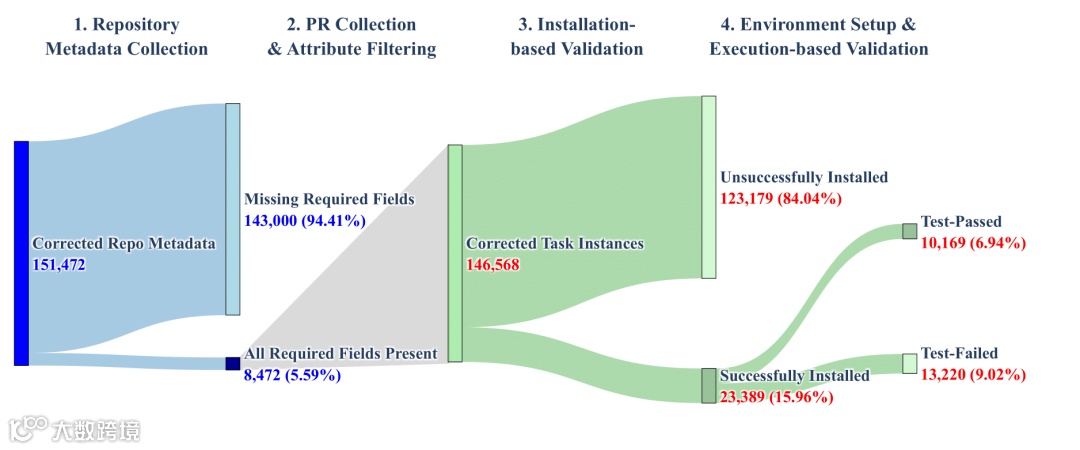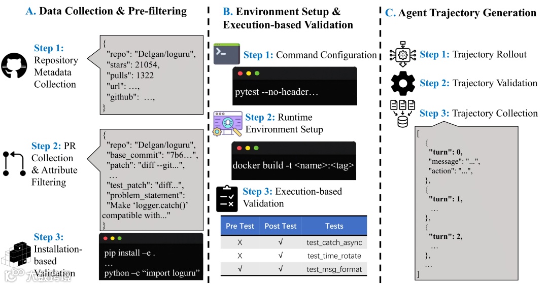 为获取高质量数据,昆仑万维构建了一套自动化、结构化且可复现的 SWE 数据收集与验证流程,涵盖三大阶段、九个步骤。团队从 15 万个 GitHub 开源项目中精心筛选,最终得到 10,169 个真实代码问题和 8,209 条多轮交互轨迹,打造出业内最大规模、可验证的 SWE 数据集。这个数据集的每个样本都达到 “工程级” 标准:每条任务都能在 Docker 中复现,每个补丁都要通过单元测试验证,每条智能体轨迹都覆盖完整修复闭环。