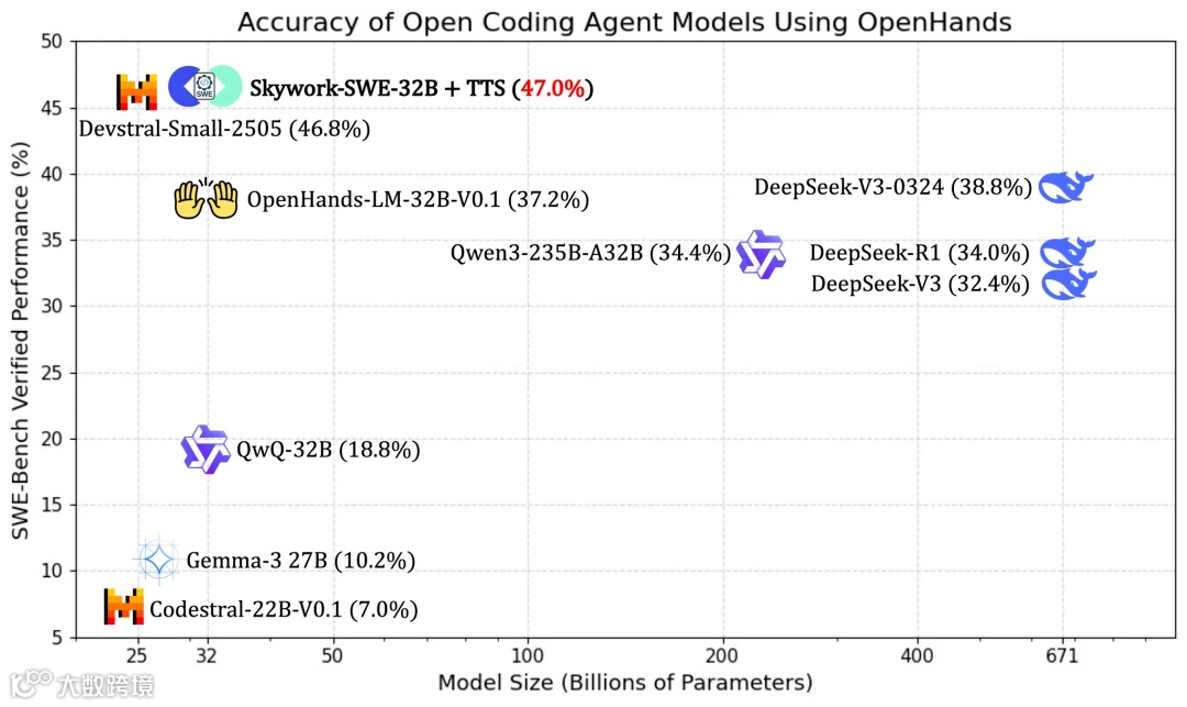 基于 Skywork-SWE 数据集,昆仑万维训练出了 Skywork-SWE-32B 模型(采用 Qwen2.5-Coder-32B-Instruct 作为基座模型)。在 SWE-bench Verified 基准测试中,该模型在 OpenHands Agent 框架下取得了 47% 的准确度,超越了 32B 以下的开源模型,甚至优于参数量高达 671B 的 DeepSeek-V3-0324 模型。实验还揭示了 LLM SWE 能力在数据方面的 Scaling Law,即随着训练数据规模的扩展,SWE 模型性能持续提升,且在当前数据集规模下,性能提升尚未饱和,展现出进一步扩展数据的巨大潜力。