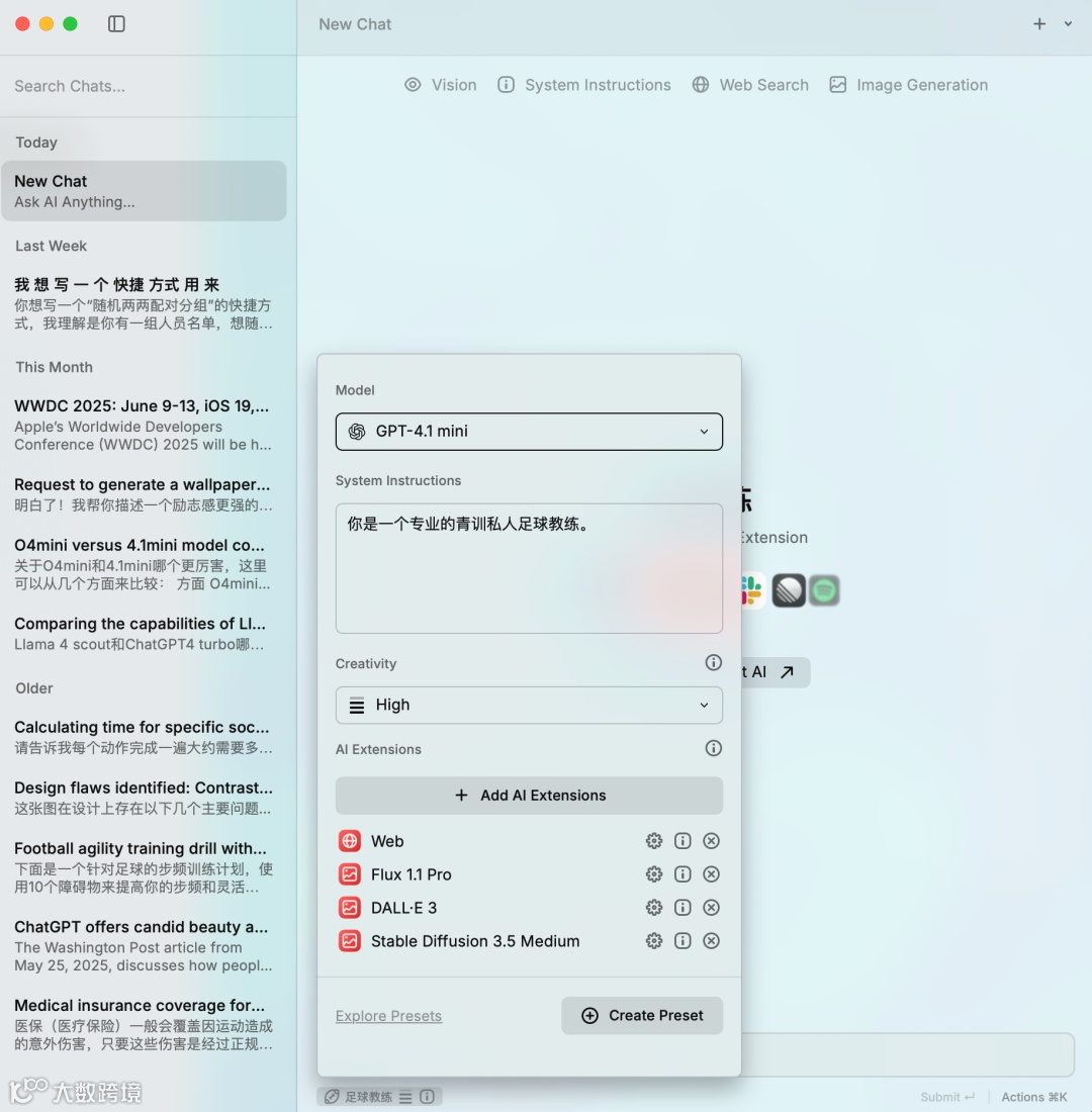 通过 Raycast 能轻松唤起 AI 聊天窗口,无论是解答问题、撰写邮件、翻译文字,还是解释代码、总结段落,它都能迅速给出准确回答,无需浏览器、登录,也没有额度焦虑。在完整的 AI 窗口中,用户不仅能调用不同大模型,还能对其个性化设置。将 Claude 3.5 设定为 “考官口吻的雅思陪练” ,为 Gemini 2.5 添加 DALL・E 扩展并设定为 “抽象主义画手”,给 Grok3 加上维基插件使其化身 “维基风 AI”,充分发挥 AI 潜力。