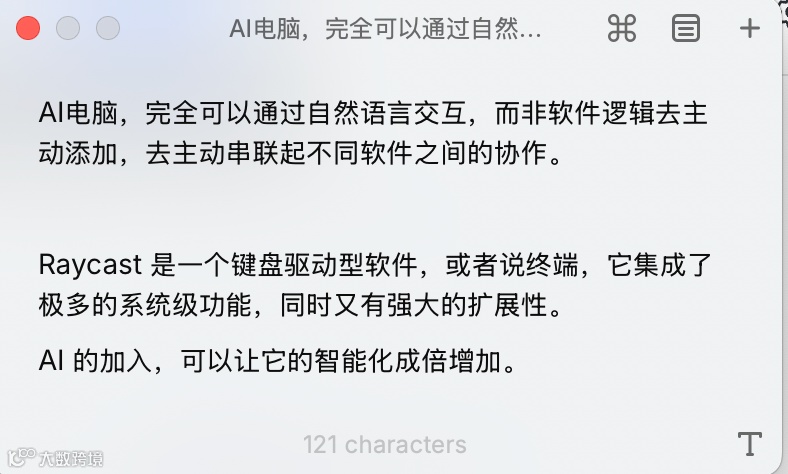 不过,Raycast 的发展前景依然广阔。随着 AI 技术的不断发展和应用场景的不断拓展,未来它有望增加中文界面支持,优化中文输入反馈。针对学习成本高的问题,可能会推出详细易懂的教程和引导功能,优化产品界面和交互设计,降低自定义难度。在付费策略上,或许会重新审视套餐设置和模型提供方式,推出更具性价比的方案,如包含更多高级模型的综合套餐,或根据使用频率和需求提供灵活付费方式。此外,随着 AI 在操作系统层面应用深入,Raycast 有望与更多软件和服务深度集成,与办公软件集成实现高效文档处理和协作,与设计软件集成给设计师提供便捷创意工具 。相信在未来,Raycast 将不断优化完善,为用户在 AI 时代的高效工作和生活提供更有力支持,成为 Mac 用户不可或缺的效率神器,引领效率工具发展潮流,展现 AI 时代桌面操作体验的无限可能。