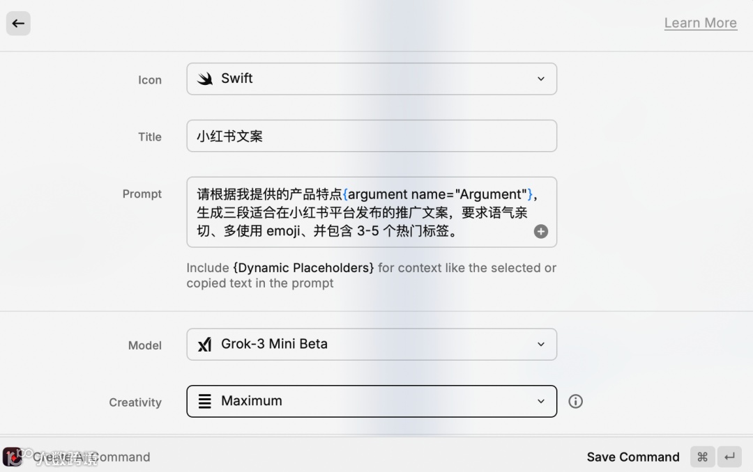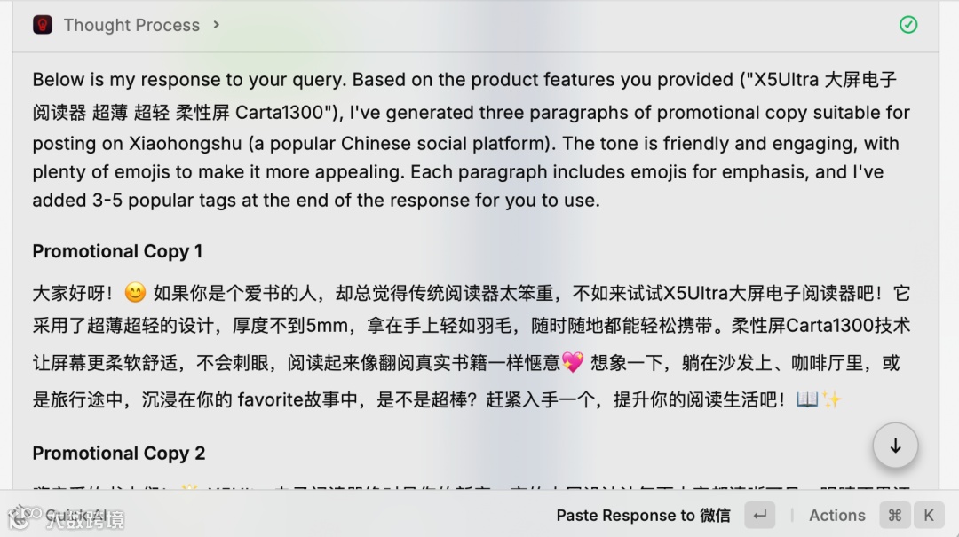 AI Commands 允许用户自定义 AI 行为方式,将常用的 Prompt 转化为快捷命令。电商运营用户编写 “请根据我提供的产品特点 {内容},生成三段适合在小红书平台发布的推广文案,要求语气亲切、多使用 emoji、并包含 3 - 5 个热门标签” 的 Prompt ,选择模型后创建 “小红书文案” 指令,之后在控制栏输入该指令,AI 就能自动生成文案。